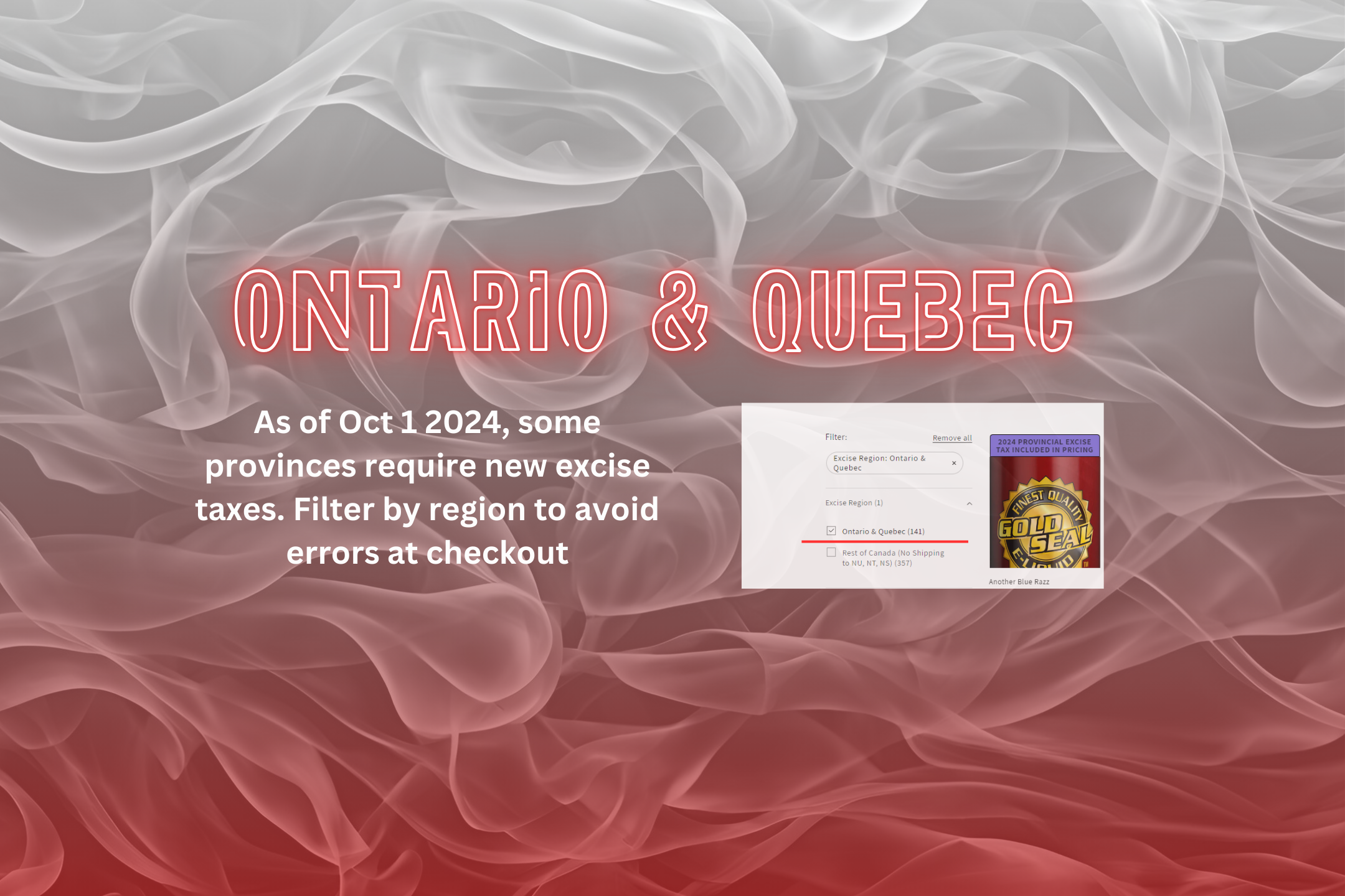 As of October 1, 2024 the above jurisdictions require both federal and provincial excise taxes on all e-Liquid shipped to those destinations. They are commonly known as coordinated excise regions.